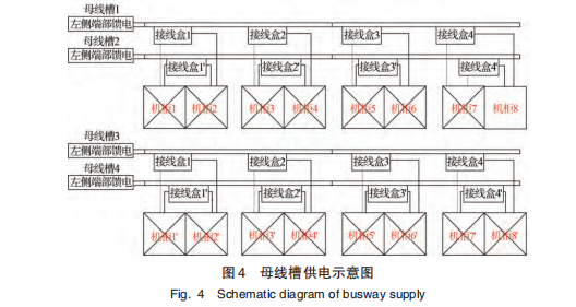 端部饋電模塊由每一列機(jī)柜對(duì)應(yīng)的主備供母線(xiàn)槽各配置1個(gè)接入配電盒,與主干母線(xiàn)槽的插接箱間采用電纜連接。